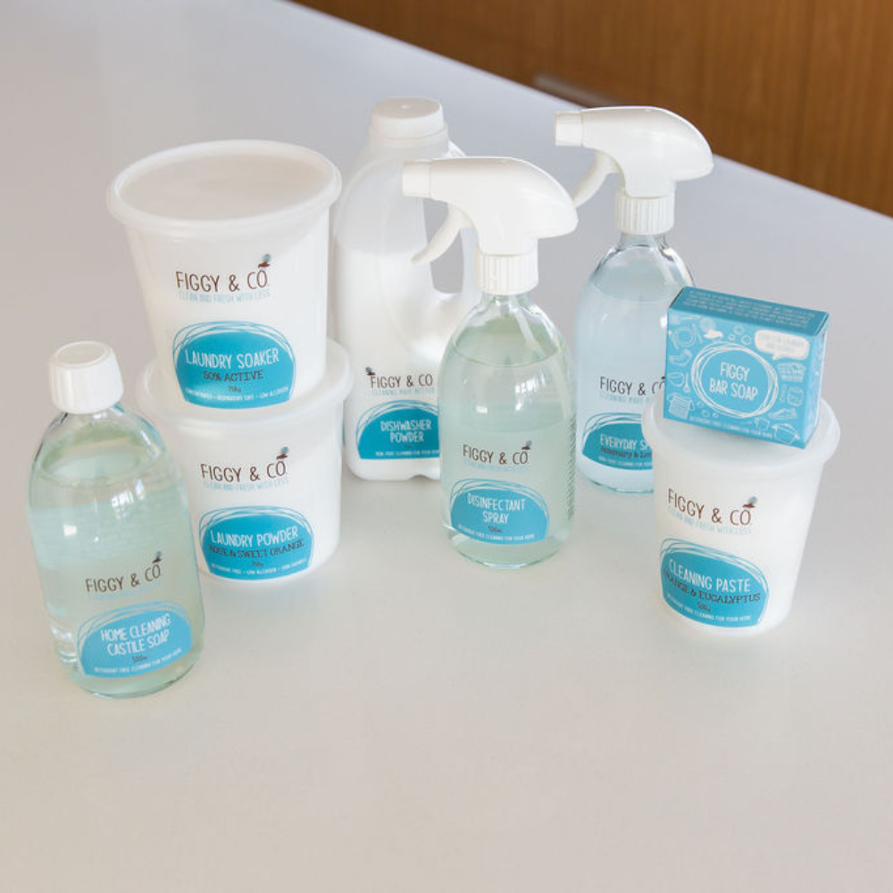 No fuss, non-toxic cleaning for every room of your home! All of your regular cleaning is covered - clean your bathroom, kitchen, living spaces & floors, do the washing, the dishes and pre-treat stains with our pared-back, family safe cleaners. Every product is formulated for safety, made in house at Figgy & Co, detergent free, non-irritating and palm oil free! Our cleaners are the preferred choice for those with asthma, eczema and chemical sensitivity